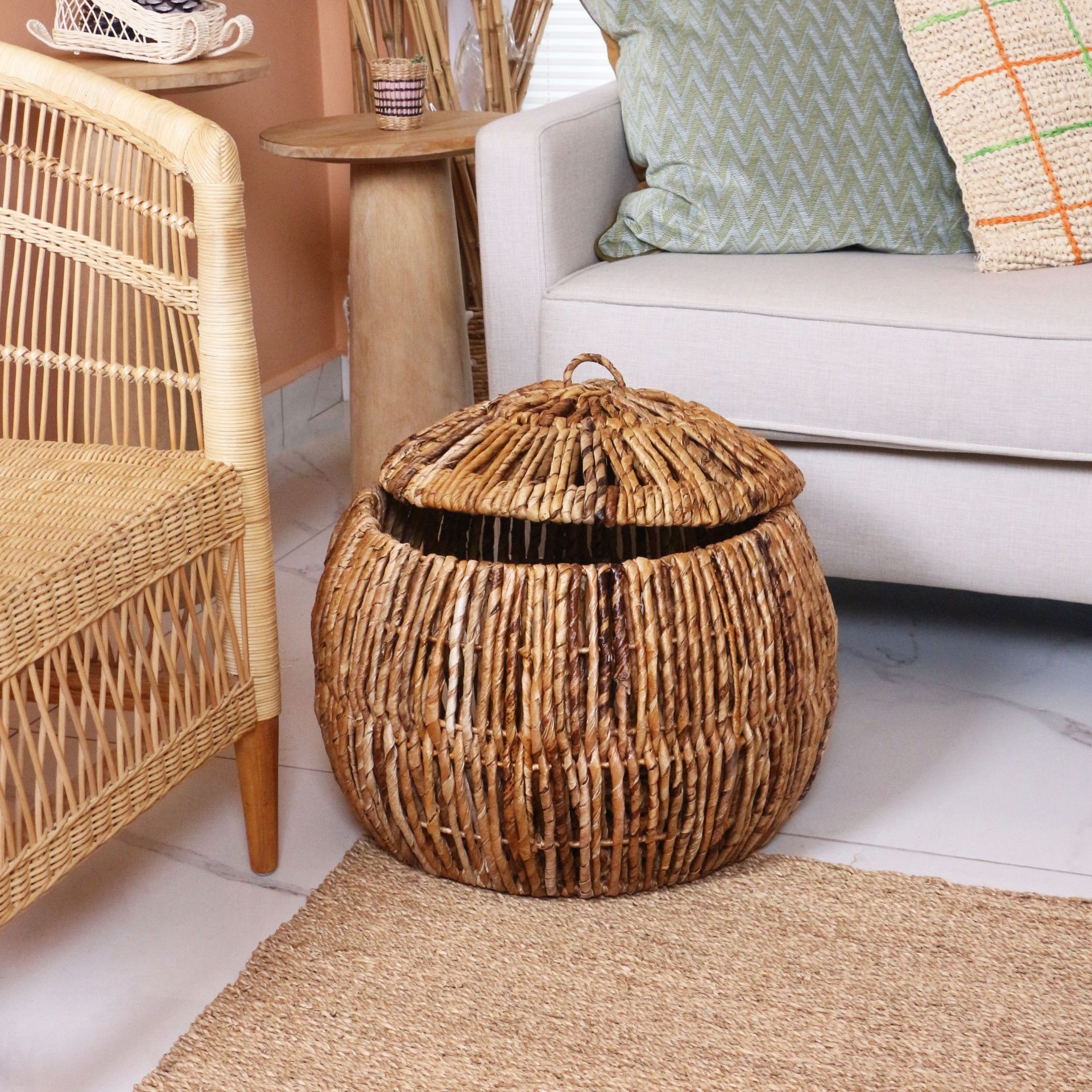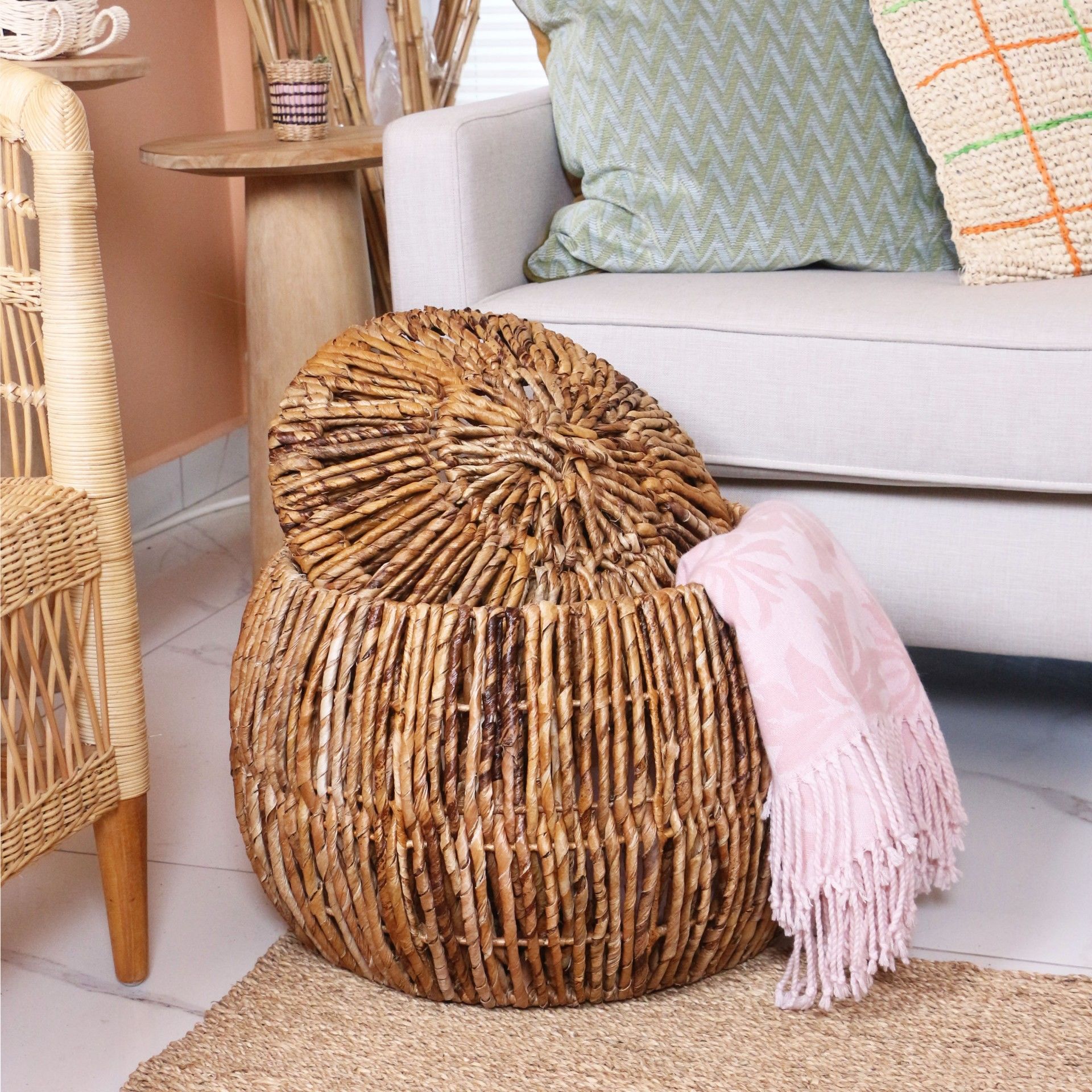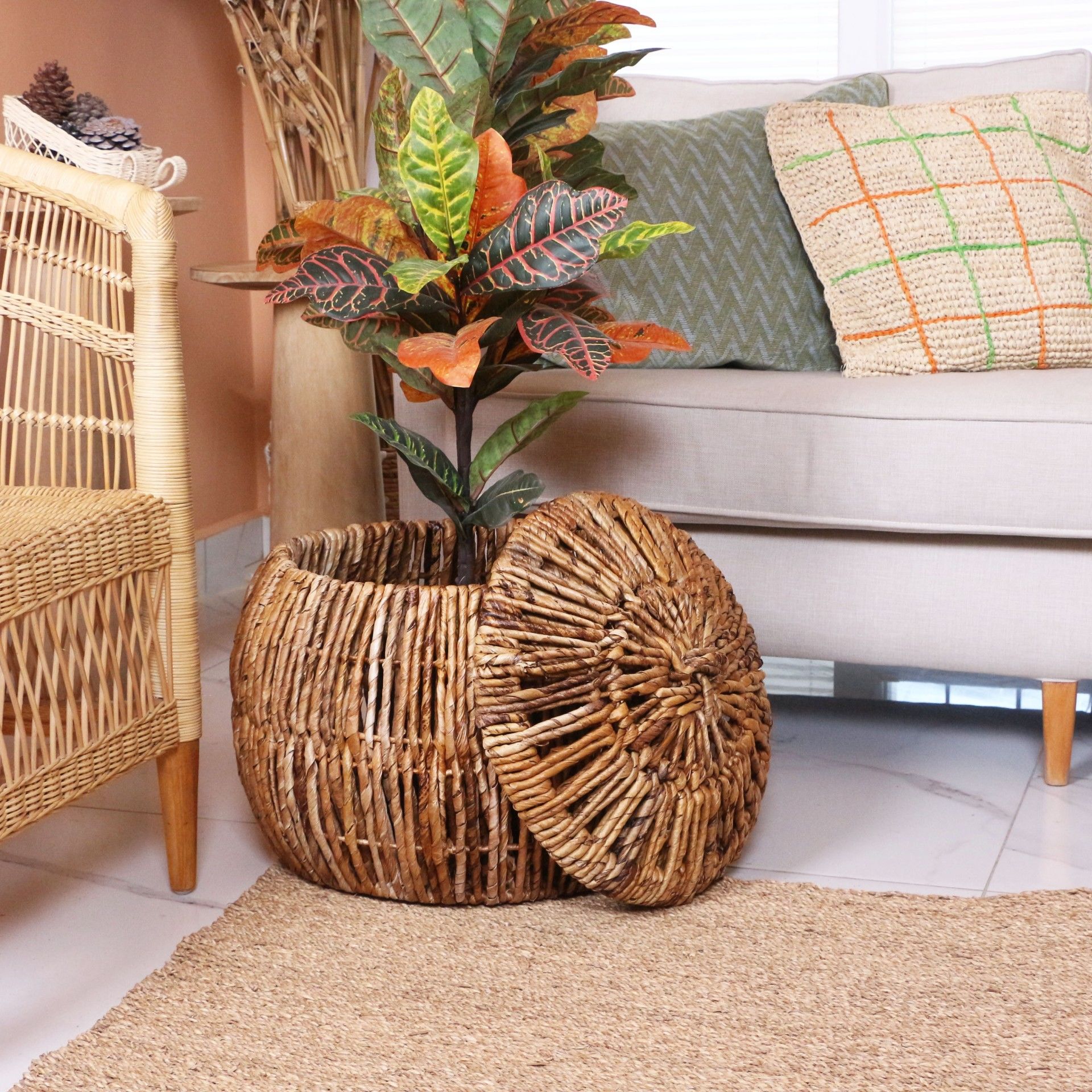 - Doğal Abaka bitkisinin yapraklarından örülen bu sepetlerimiz sağlam ve tok durması için bitkinin dokusuna uygun statik boyalı tel kafes üzerine tamamı el işçiliği ile örülmüştür.