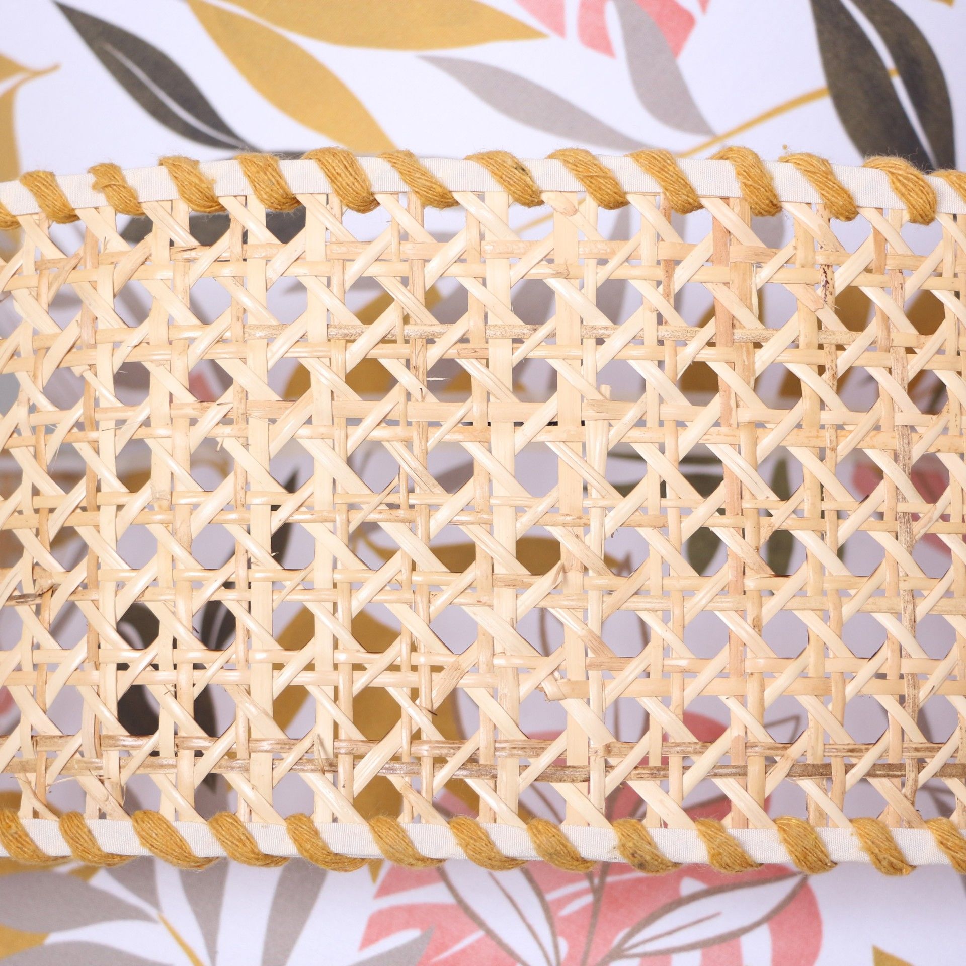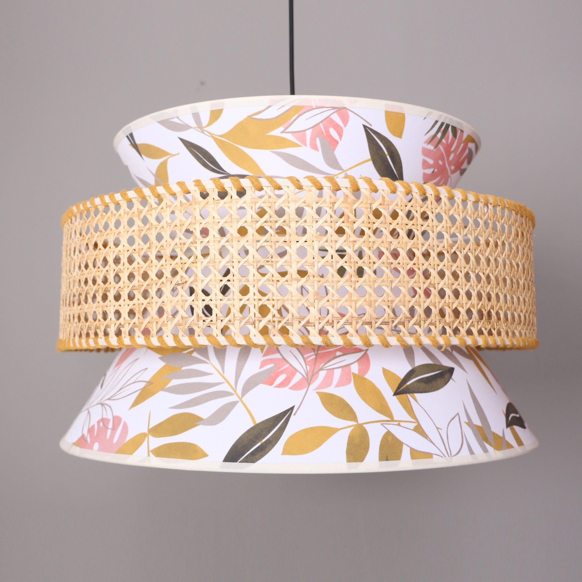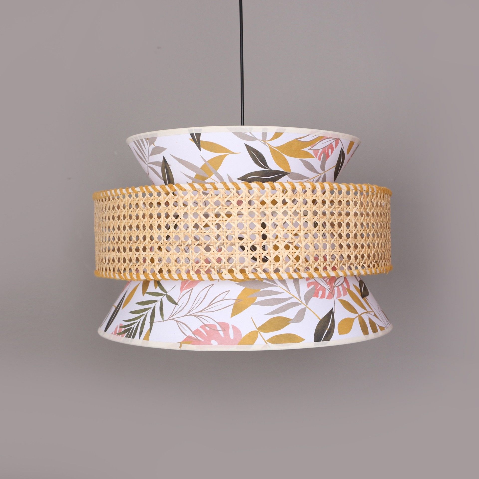 - İmalat Ürünümüz; doğal hazeran malzemeden ve ışık geçirgenliği olan özel baskılı abajur kumaşından statik boyalı tel üzerine el işçiliği ile üretilmiştir.