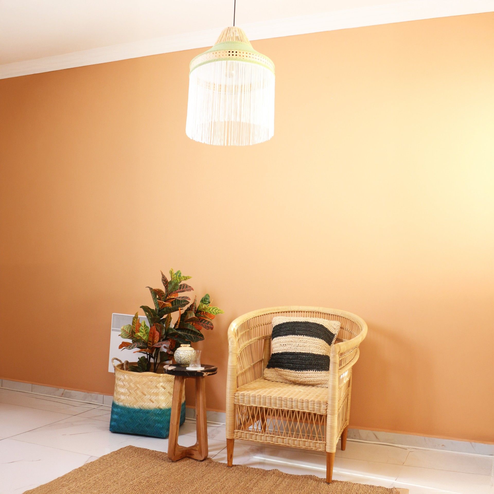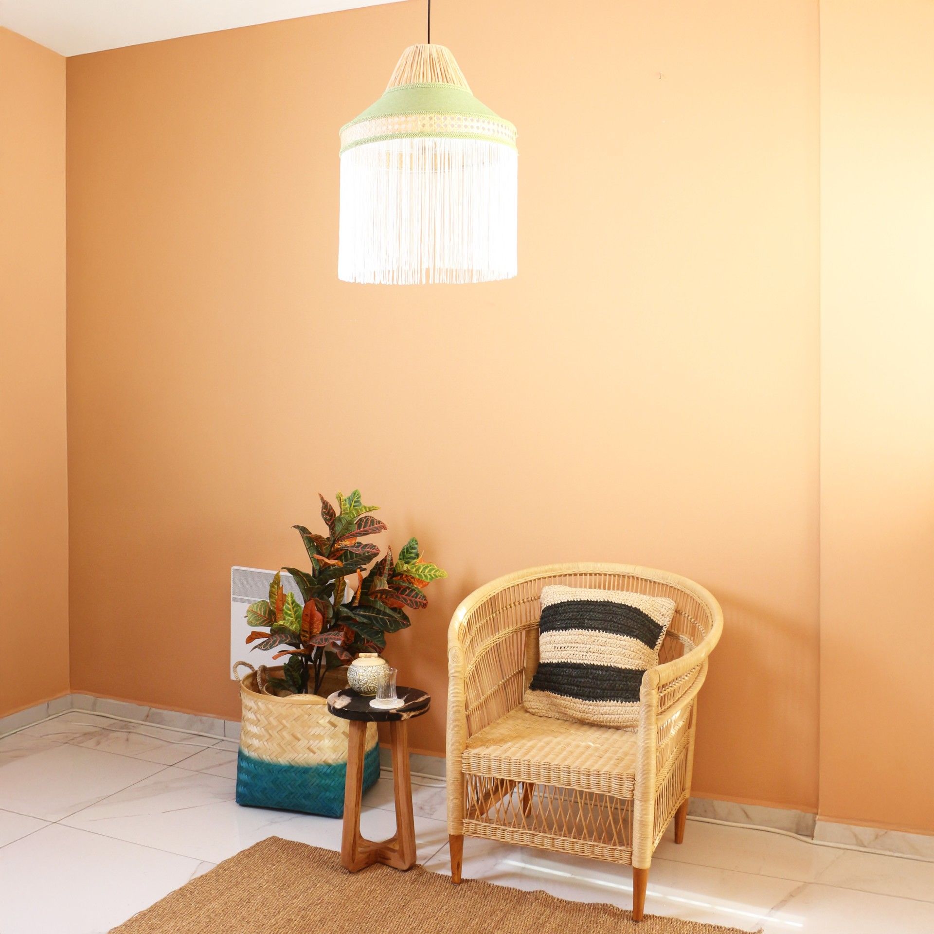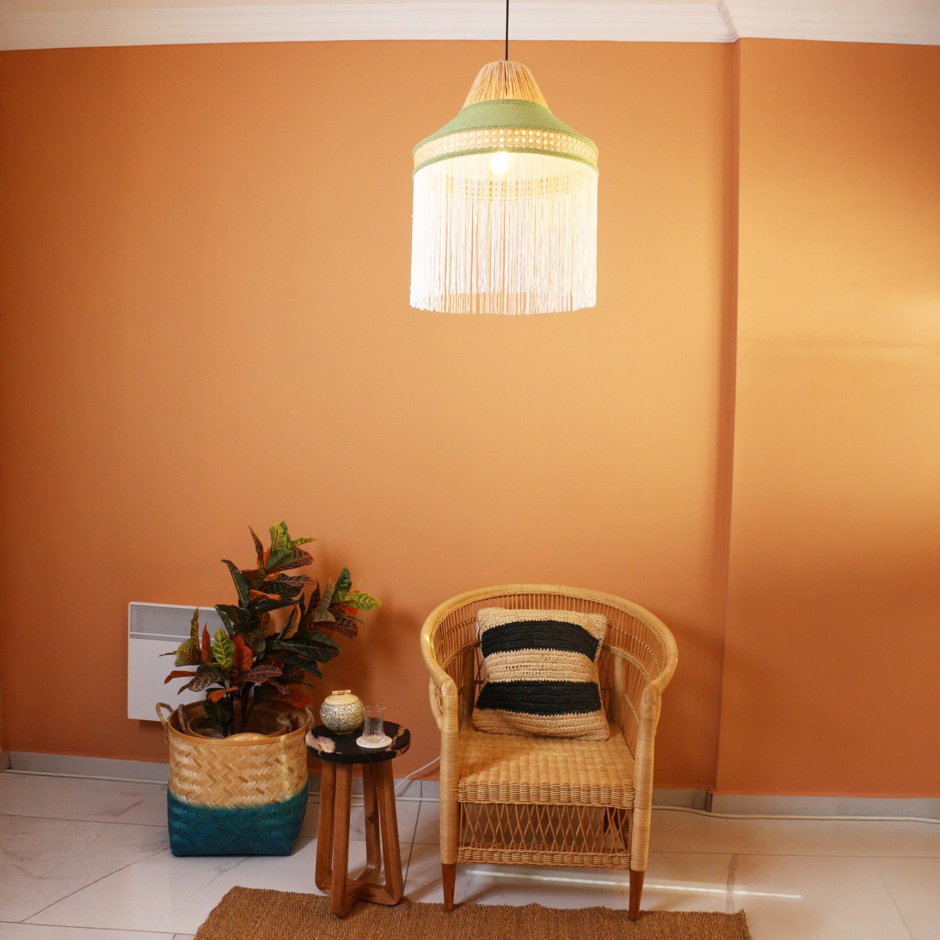- İmalat Ürünümüz; Işık geçirgenliğiolan abajur kumaşı ve doğal hazeran ve doğal rafya kullanılarak, statik boyalı tel üzerine el işçiliği ile üretilmiştir. İmalat ürünümüzde, bütün detaylar düşünülerek saçak, kadife biyeler, sutaşı ve özel ipler kullanılmıştır.