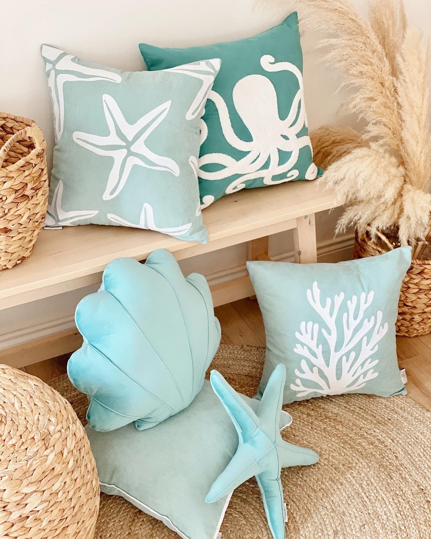 Deniz konsepti yastıklar. Ahtapot desenli yastık. Deniz kabuğu yastık. Lüks yat yastıkları. Deniz yıldızı yastık. Yat aksesuarları. Yat için yastık kılıfı. Yat dekorasyonu