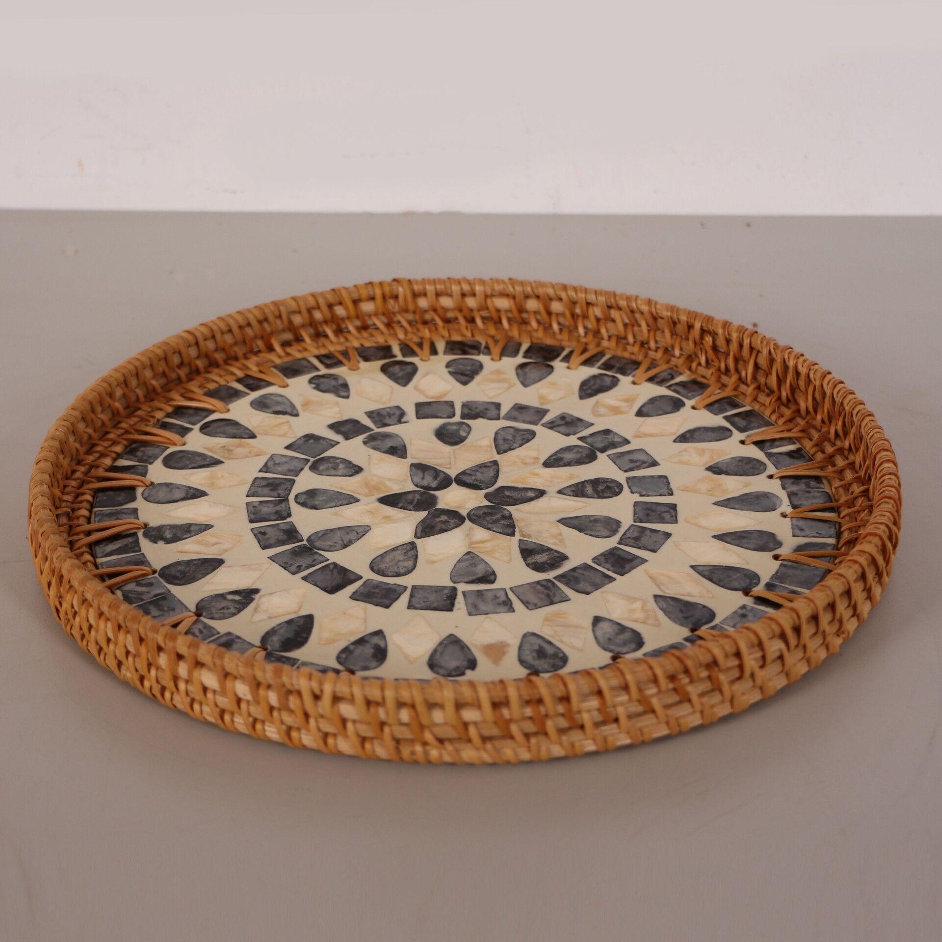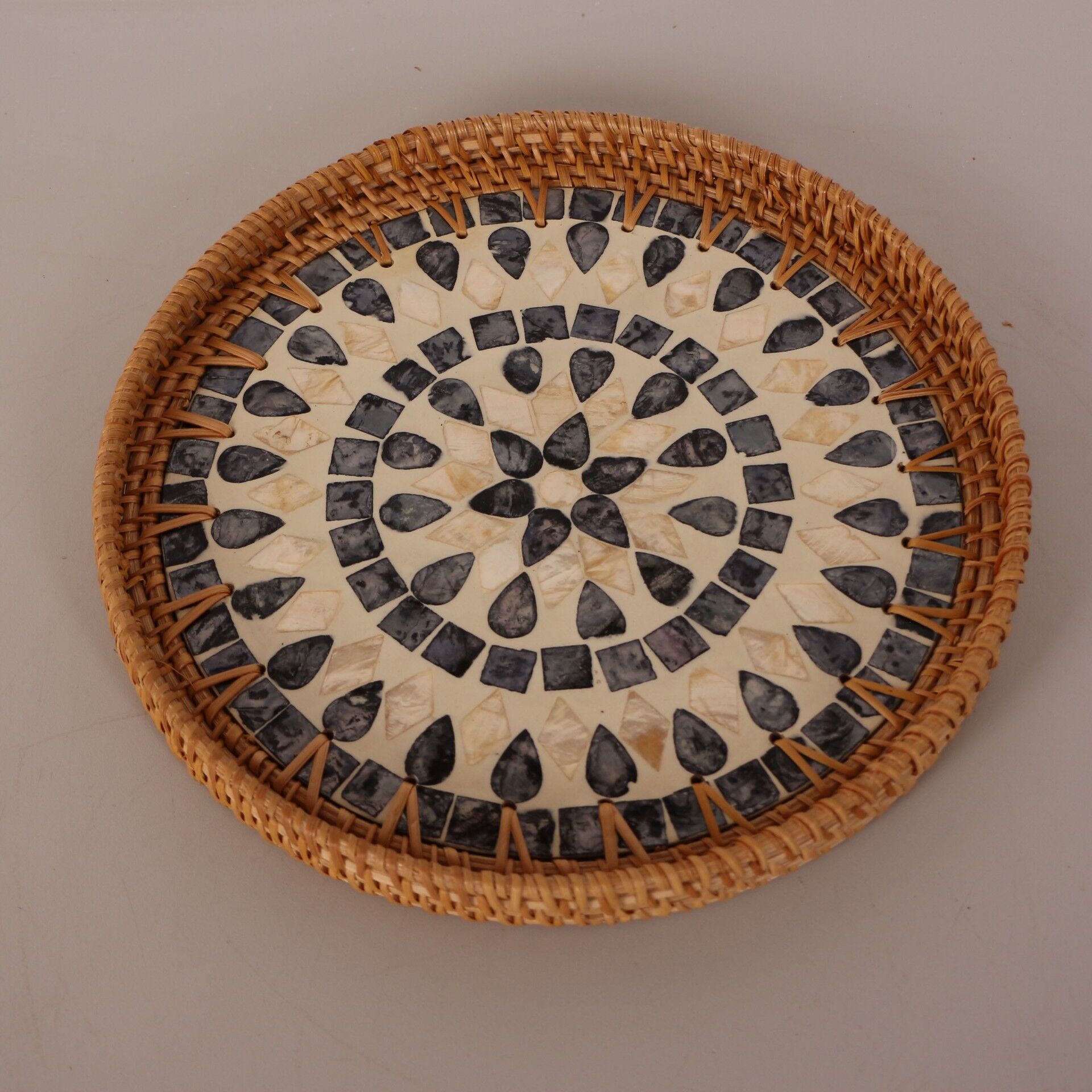 30 cm çapında ve 3 cm yüksekliğinde, orta boy, doğal rattan çerçeveli ve siyah damla desenli mandala formunda sedef mozaik kaplamalı dekoratif tepsi. El işçiliği ile üretilmiş olup duvar dekoru ve sunum için idealdir.